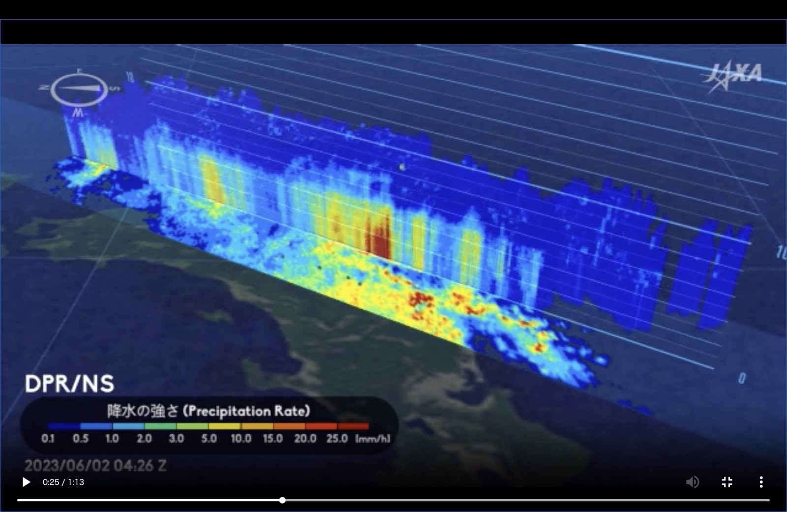 画像は動画からのキャプチャーですが、中部地方から東日本の降水を観測し、特に静岡県で場所によっては70mm/hrを上回る強い降水を観測しています。この衛星のすごいところは、雨の立体構造がわかることです。雨雲のCTスキャンですね。