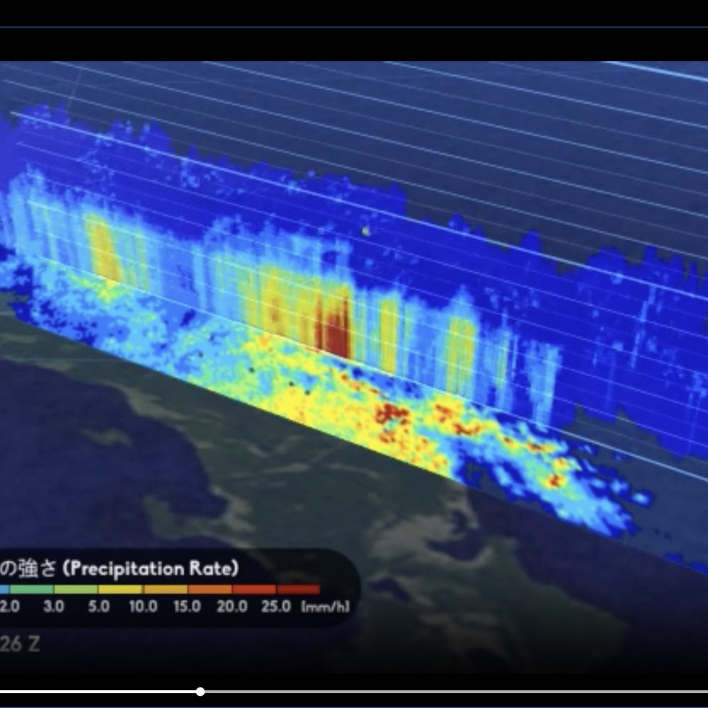 画像は動画からのキャプチャーですが、中部地方から東日本の降水を観測し、特に静岡県で場所によっては70mm/hrを上回る強い降水を観測しています。この衛星のすごいところは、雨の立体構造がわかることです。雨雲のCTスキャンですね。