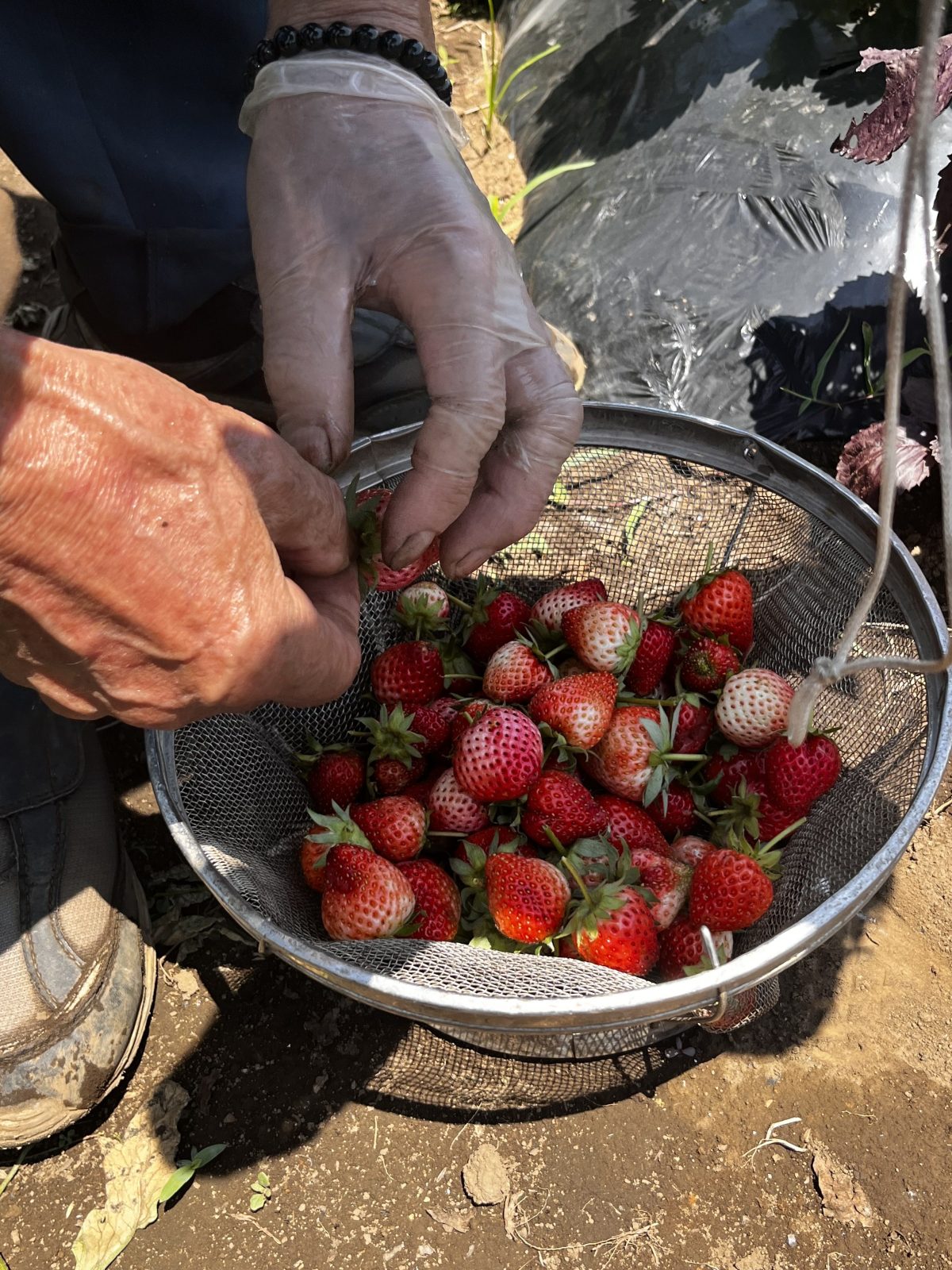 一緒にいちごを収穫。こんな時期にいちご!と思いながらも一緒に摘む、がやり方が違う