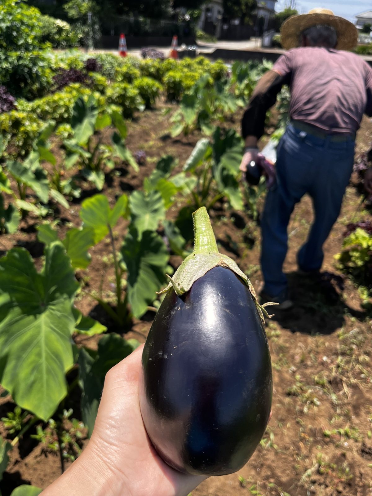 もう全てが大振りで立派!こちらナスです。重たいわ、ガク部分の棘の痛いこと、痛いこと。