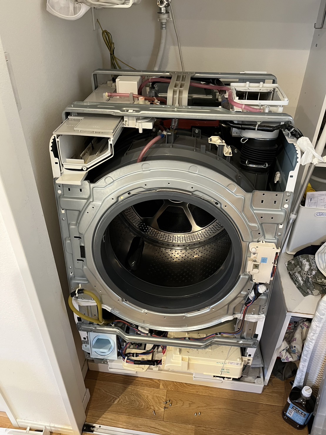 ドラム式洗濯機をバラして清掃しようとして、「もう引き返せない。」と悟った時の図。