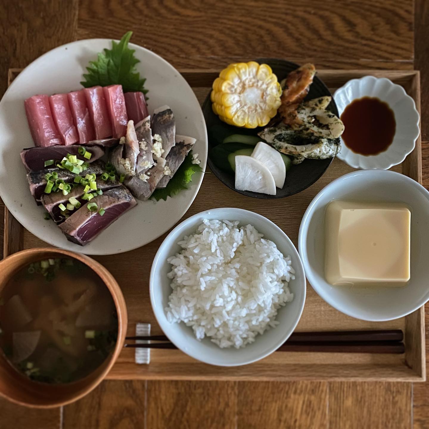 お刺身、卵豆腐、ちくわの青海苔マヨ炒め、茹でもろこし、糠漬け、味噌汁(昨日の)、白ごはん