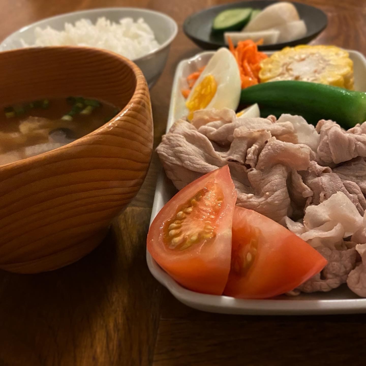 豚しゃぶ(ゆで卵、オクラ、トマト、茹でもろこし、キャロットラペ)、糠漬け、味噌汁(しめじ、大根、油揚げ)、白ごはん