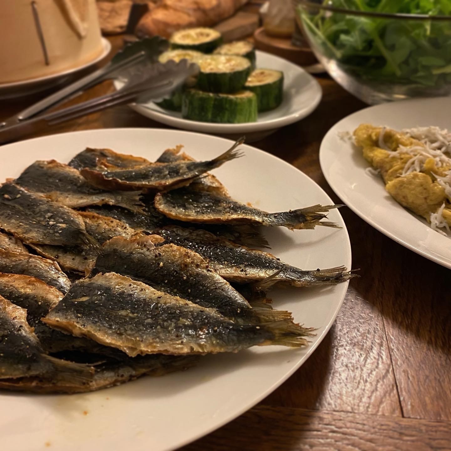 鰯のオーブン焼き、ズッキーニのソテー、シラスオムレツ、ルッコラサラダ、じゃが芋(蒸しただけ)、トマト、バゲット