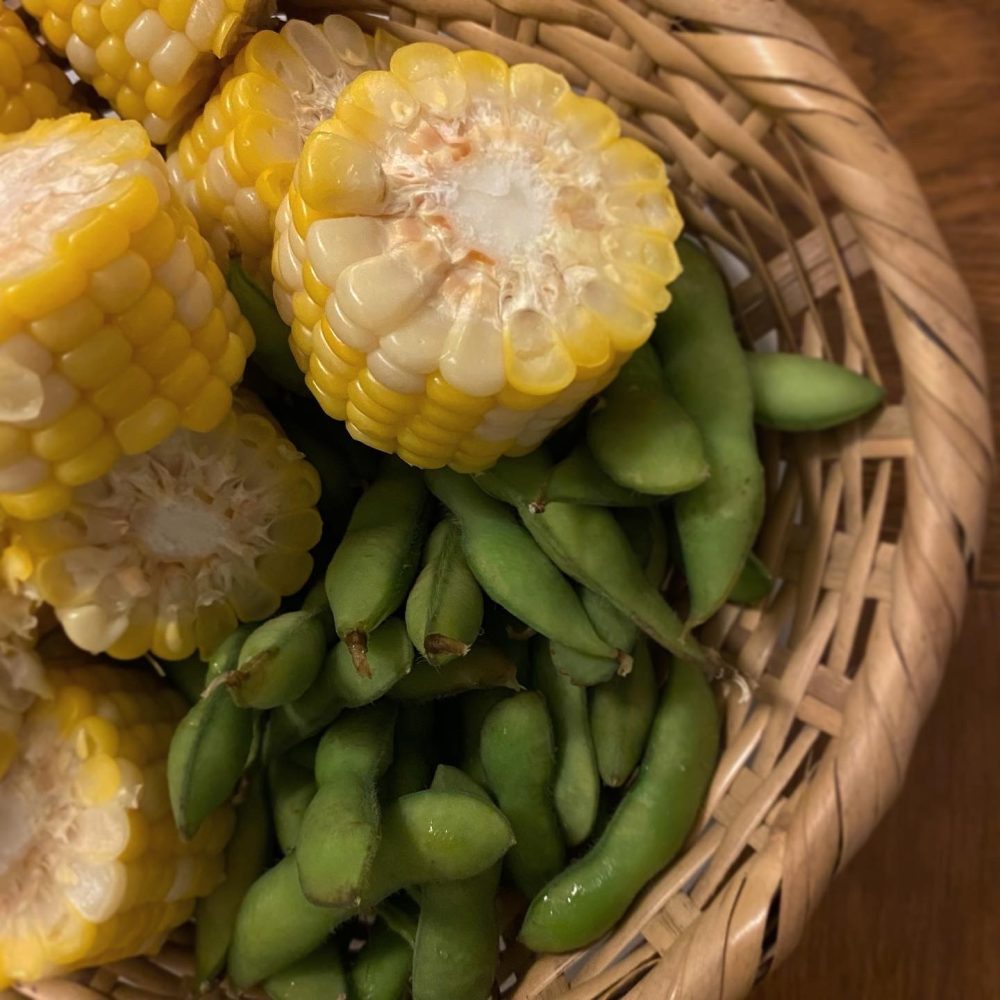 豚しゃぶ(ゆで卵、オクラ、トマト、茹でもろこし、キャロットラペ)、糠漬け、味噌汁(しめじ、大根、油揚げ)、白ごはん