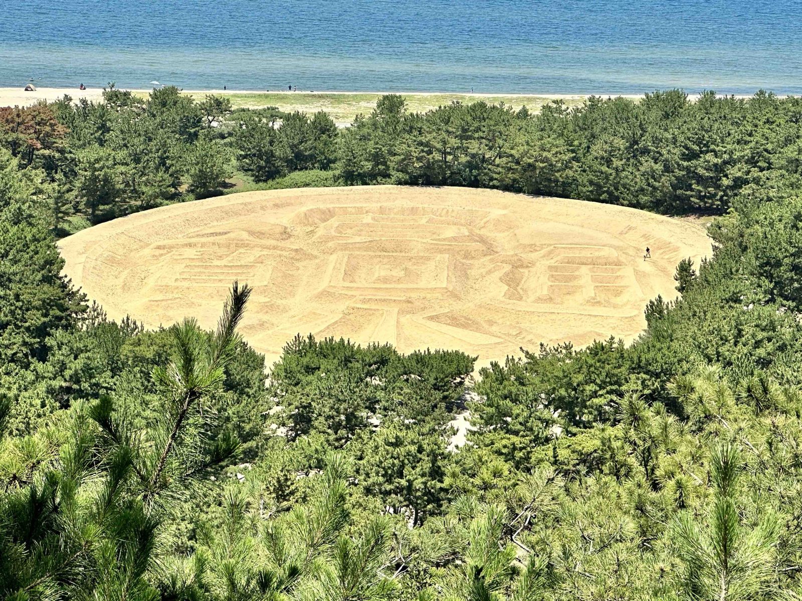 本場のうどんに満足したあとは、うどん屋さんの近くにある「銭形砂絵(ぜにがたすなえ)」に向かいました。江戸時代の貨幣「寛永通宝」を模した巨大な砂絵が砂浜に描かれている砂浜。江戸時代に作られたもので、僕も以前から存在は知っていたんですけど。