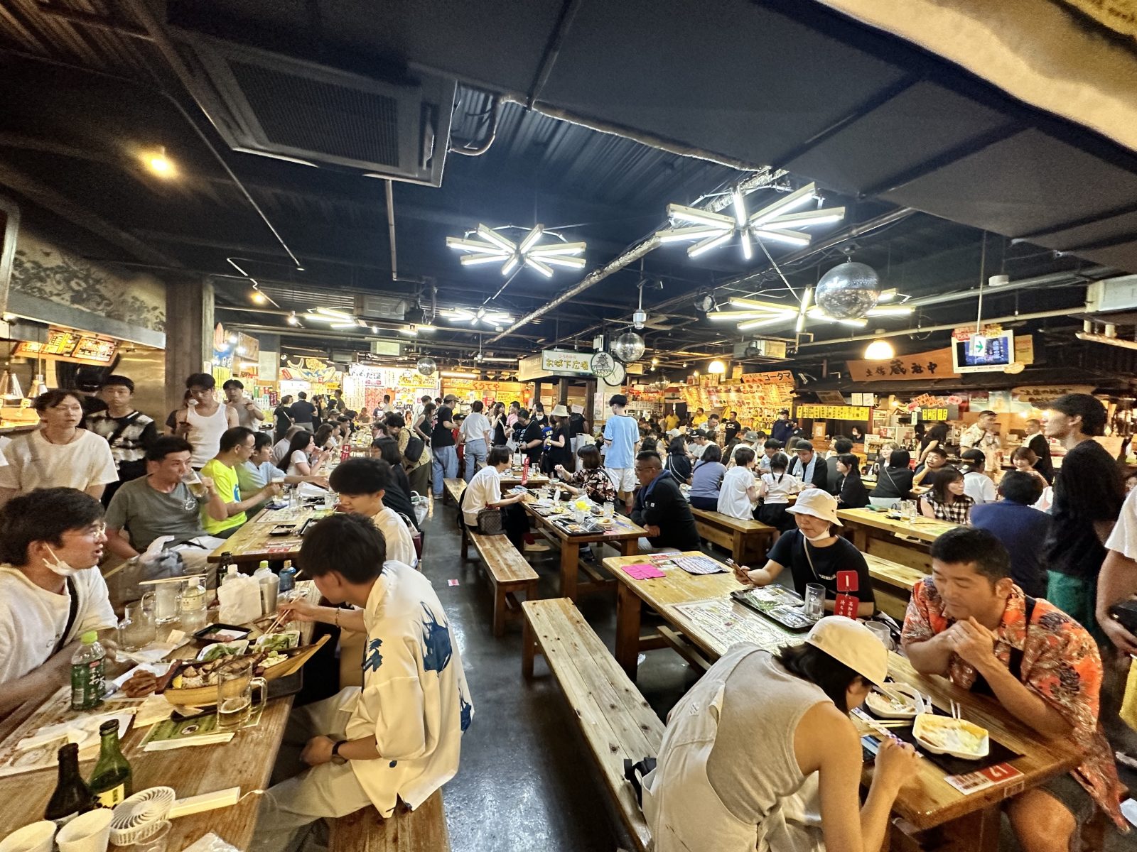 フードコートの居酒屋版、みたいなところなんですけど。とにかくたくさんのお店があって、お客さんも多い。相席とかさせてもらえばいいんだろうけど、汗だくのおじさんが隣に来たら嫌かもな、と思って僕は1時間くらい座る場所を確保できませんでした。