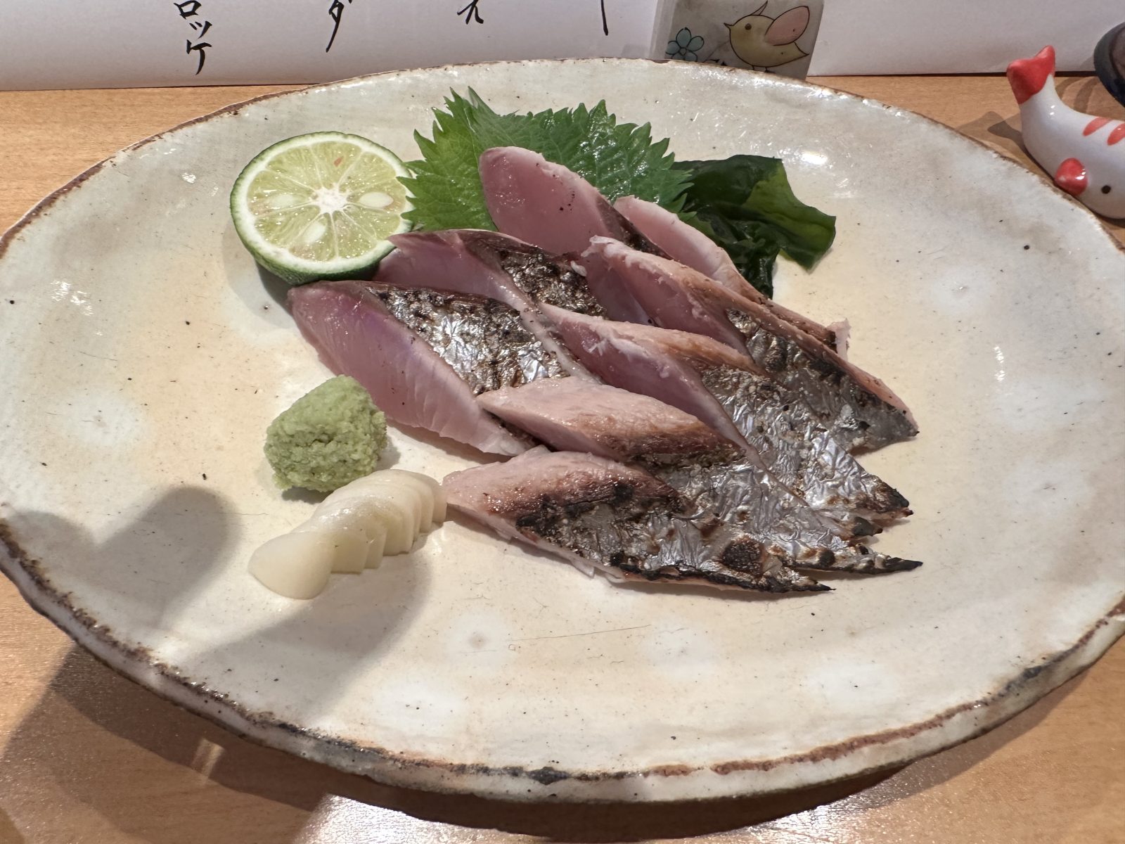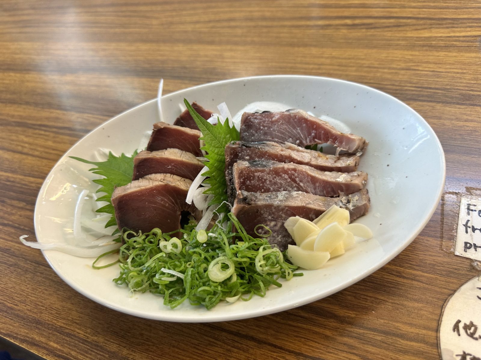 ふらっと入ったお店で、またカツオを食べようと思って、カツオのたたきを注文しようとしたら、「県外から?うちのオススメの食べ方で食べてみる?」と薦めてくれたので「はい、それお願いします」で出てきたのが「カツオの焼き切り」というもの。