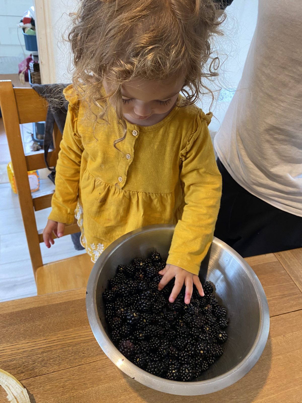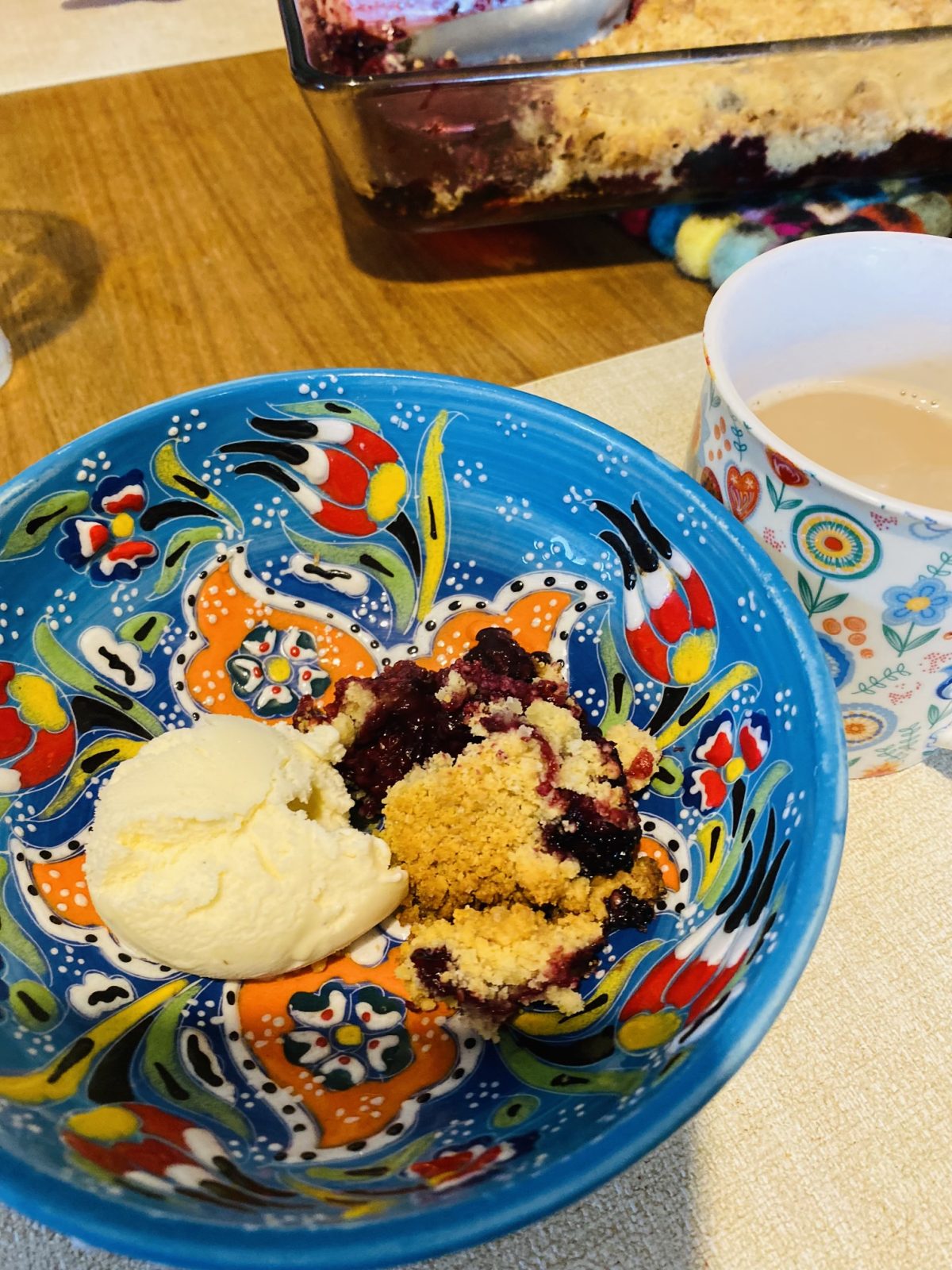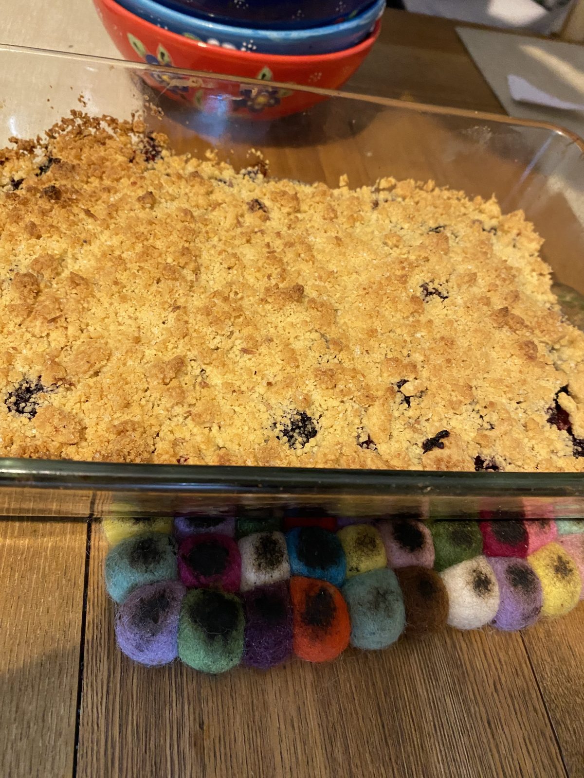 小麦粉、アーモンドフラワー、砂糖、冷えたバターを混ぜて作るクランブル。洗ったブラックベリーの上に載せてオーブンで焼くだけ。