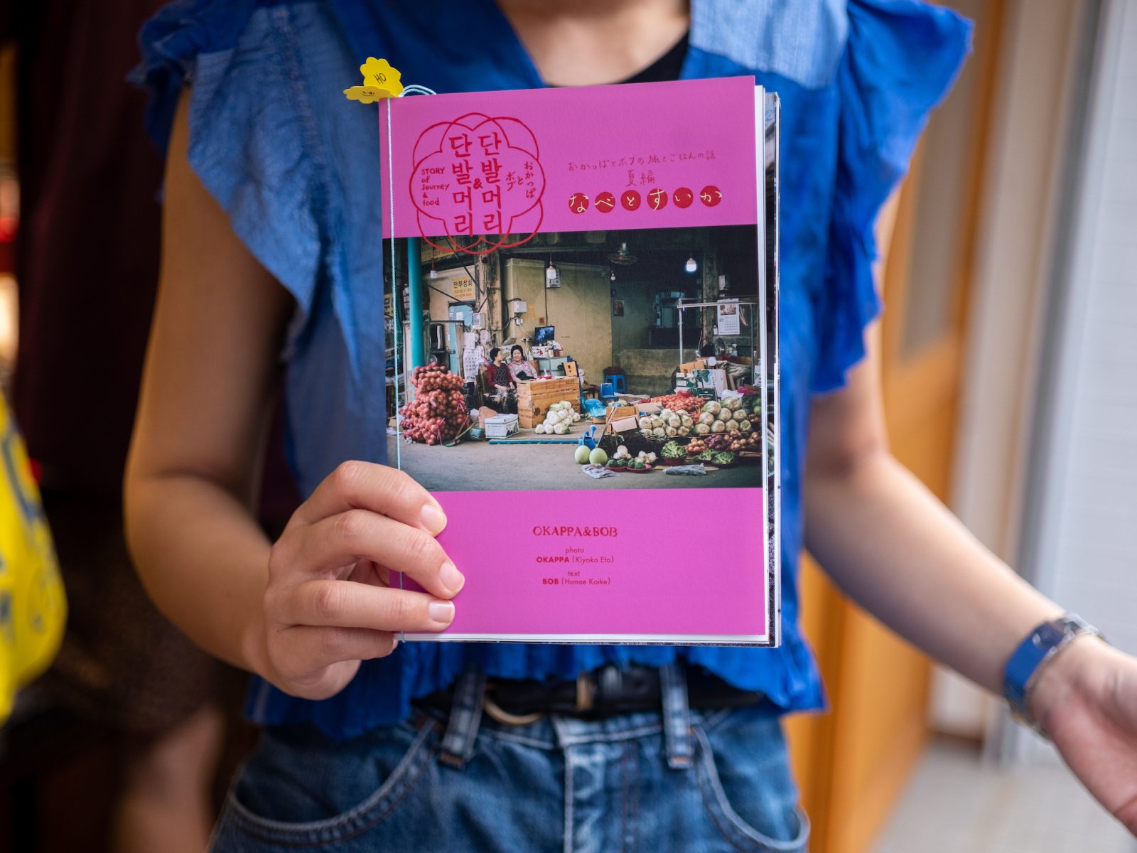そして、ポスターやキーホルダー、おかっぱとボブ初めてのZINEをデザインしてくださったデザイナーで作家の外山夏緒さんのおかげで、展示でたっぷりおかっぱの写真を見た後も、見ると微笑んでしまう韓国のオモニたちの日常や、いまにも匂いが漂ってきそうなジョン(チヂミ)の写真を手元に持って帰っていただけるような、おかボブ本人たちにとっても宝物になるアイテムをたくさん作ることができました。ねばり強くこちらの「こうしたい、ああしたい」にお付き合いくださって、ほんとうに頭の上がらないアイディアの泉外山さん。ZINEを手にとってくださる皆さんが、ページをめくっていて楽しいと皆さん外山さんのデザインを大絶賛でした。
