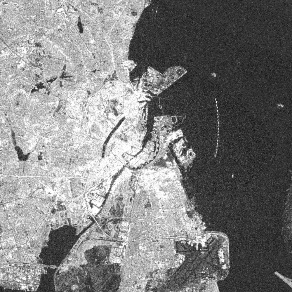 2023年4月2日 コペンハーゲンをヨーロッパのSentinel-1の合成開口レーダーで観測した画像です。黒い部分が海です。一見暗いだけの海面もよく見ると濃淡も見えます。これが波の分布。暗いところは穏やかで、明るいところは波が立っているところです。真ん中から若干東よりの海上に縦の点々が見えます。これが風力発電の風車の列です。デンマークは風力発電の先進国。そして日本にも十分可能性がある!