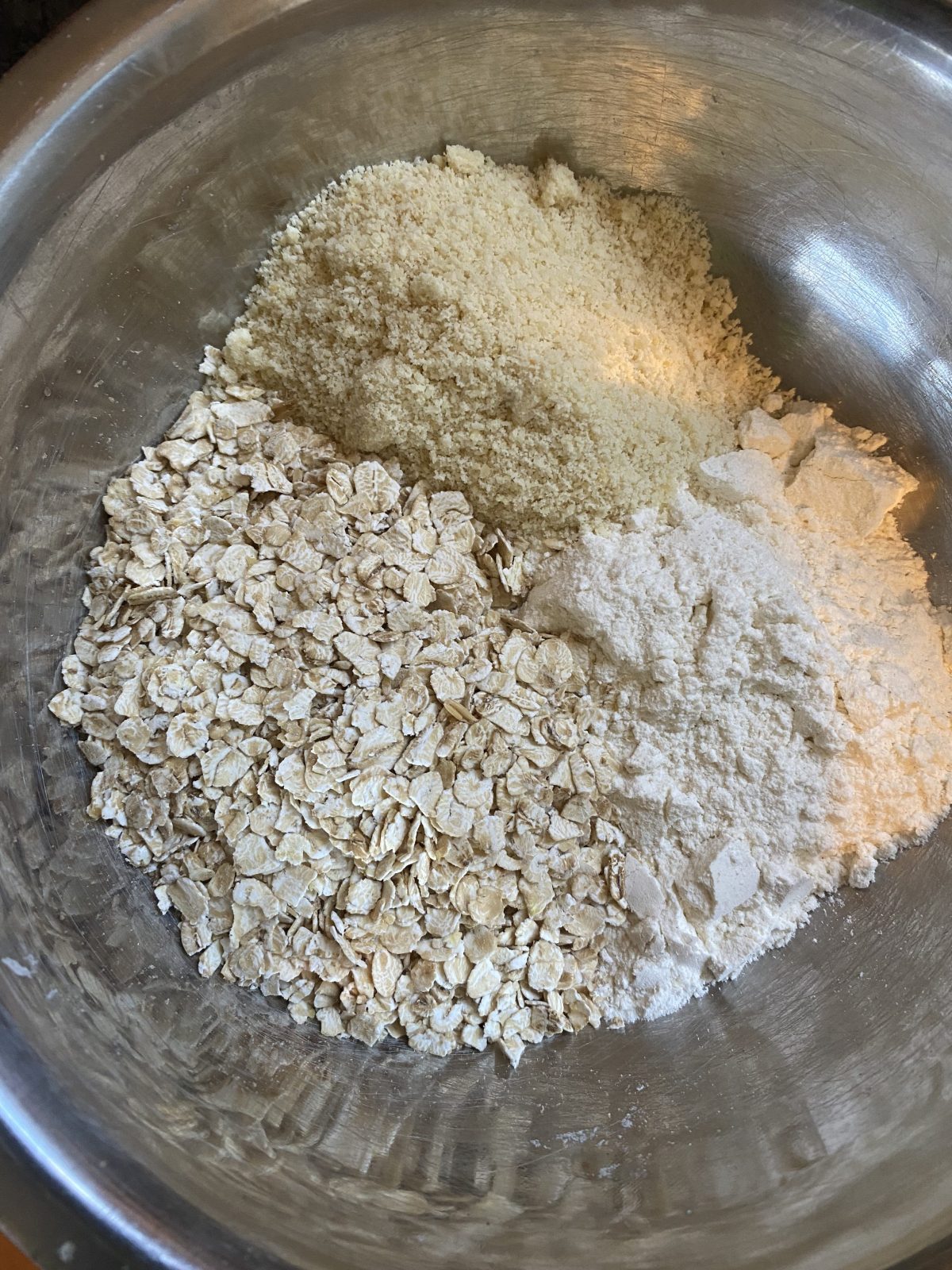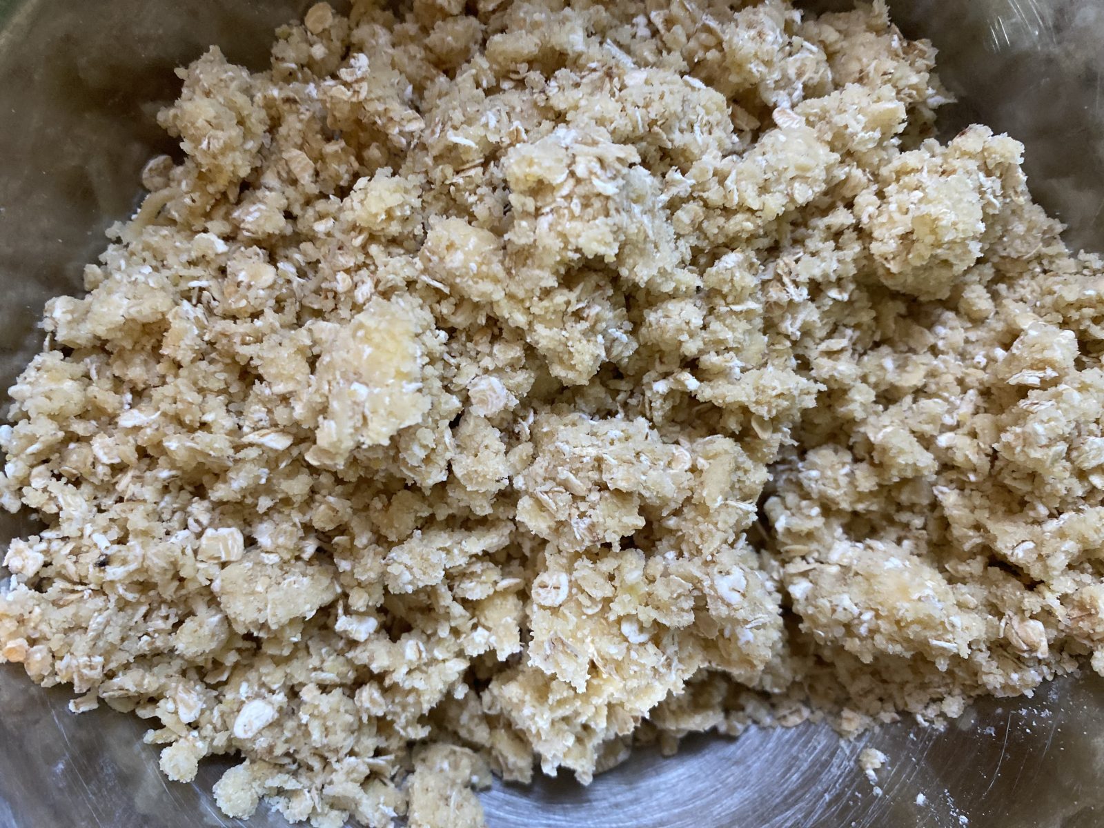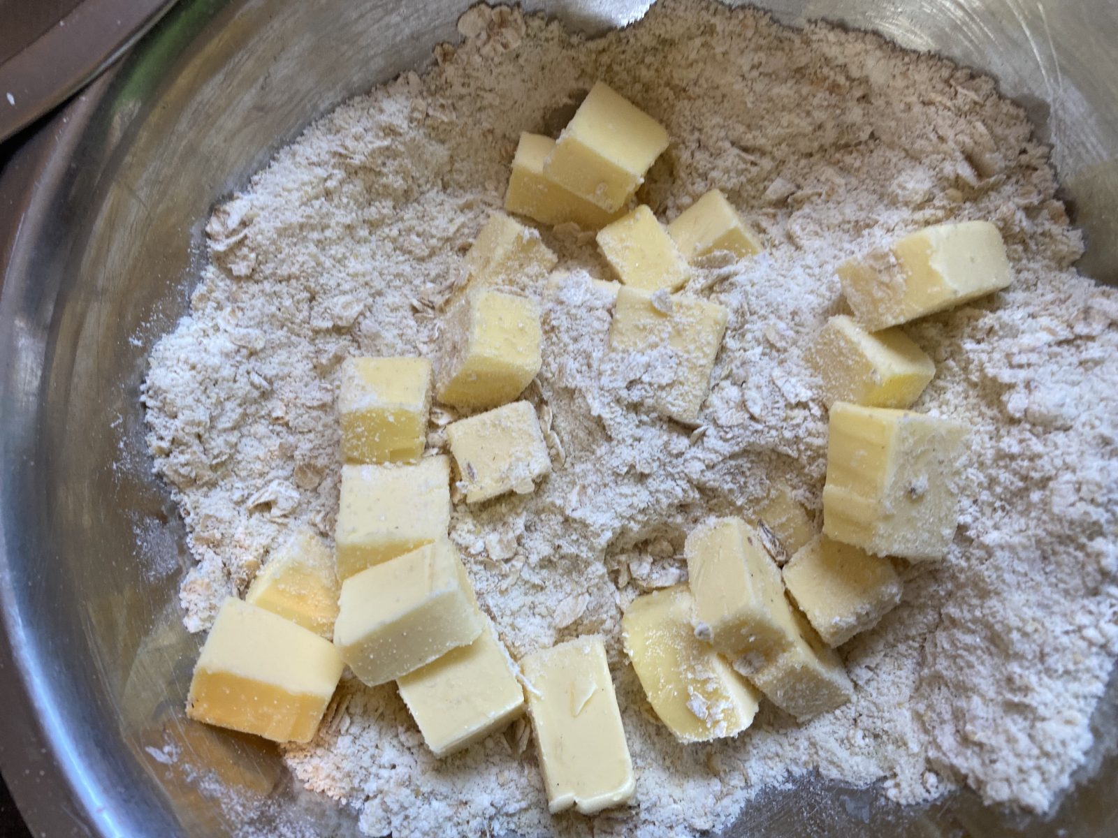 小麦粉、アーモンドフラワー、オートミールと砂糖を混ぜて冷やしておいた角切りバターを指で揉みながら混ぜる。