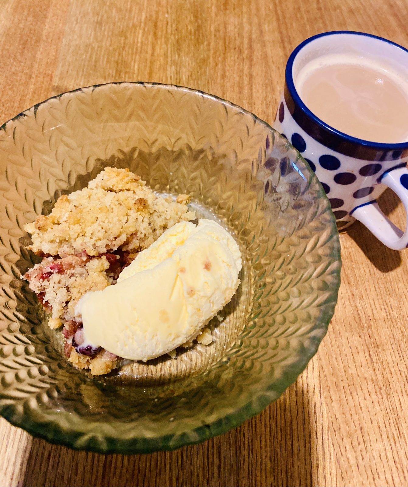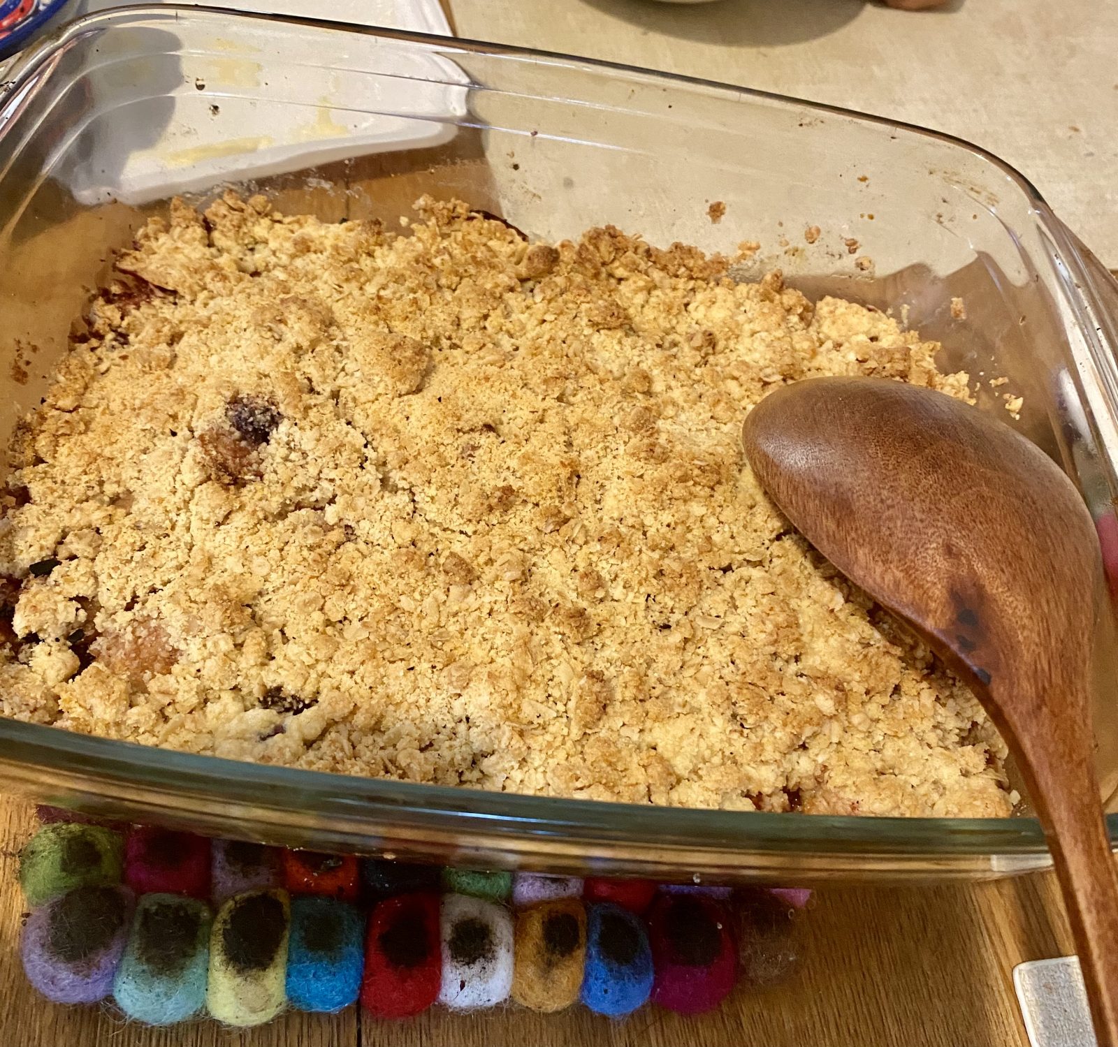 数週間前にたくさん採って冷凍しておいたブラックベリーとリンゴのクランブル、最高。