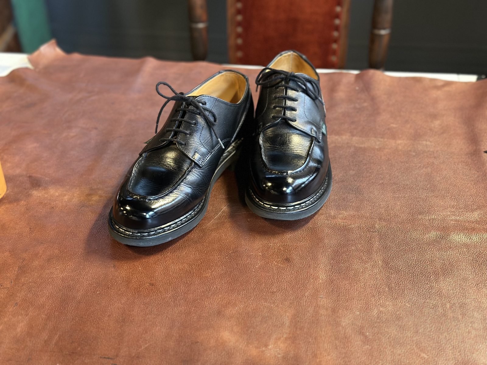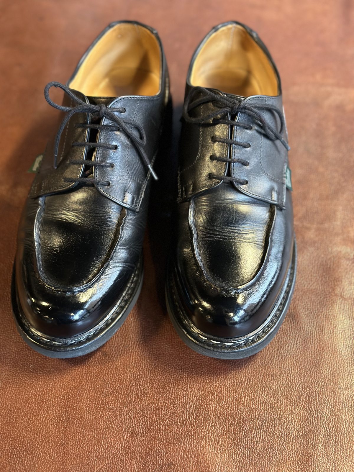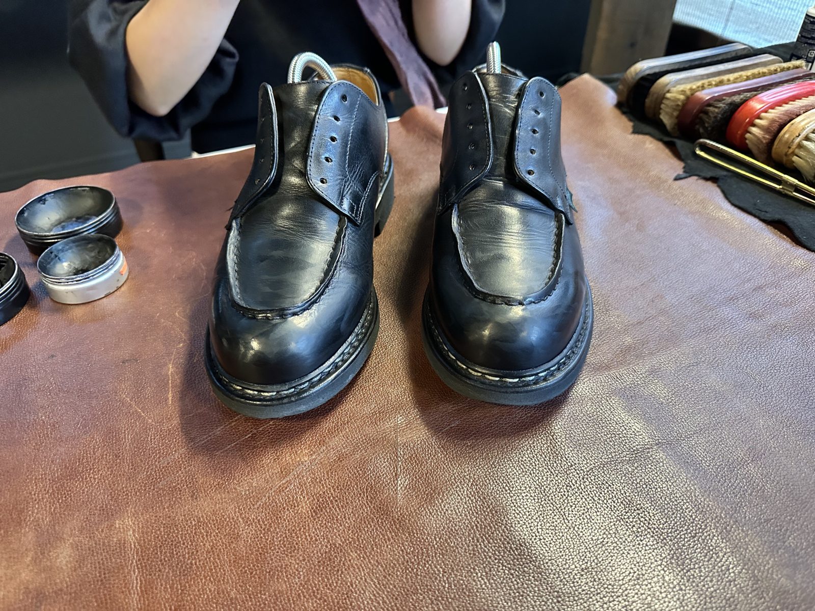 何を磨いてもらおうか悩んだ挙句、僕があまり思うように上手く磨けない黒い靴を持ち込んで いとさんにお願いしました。