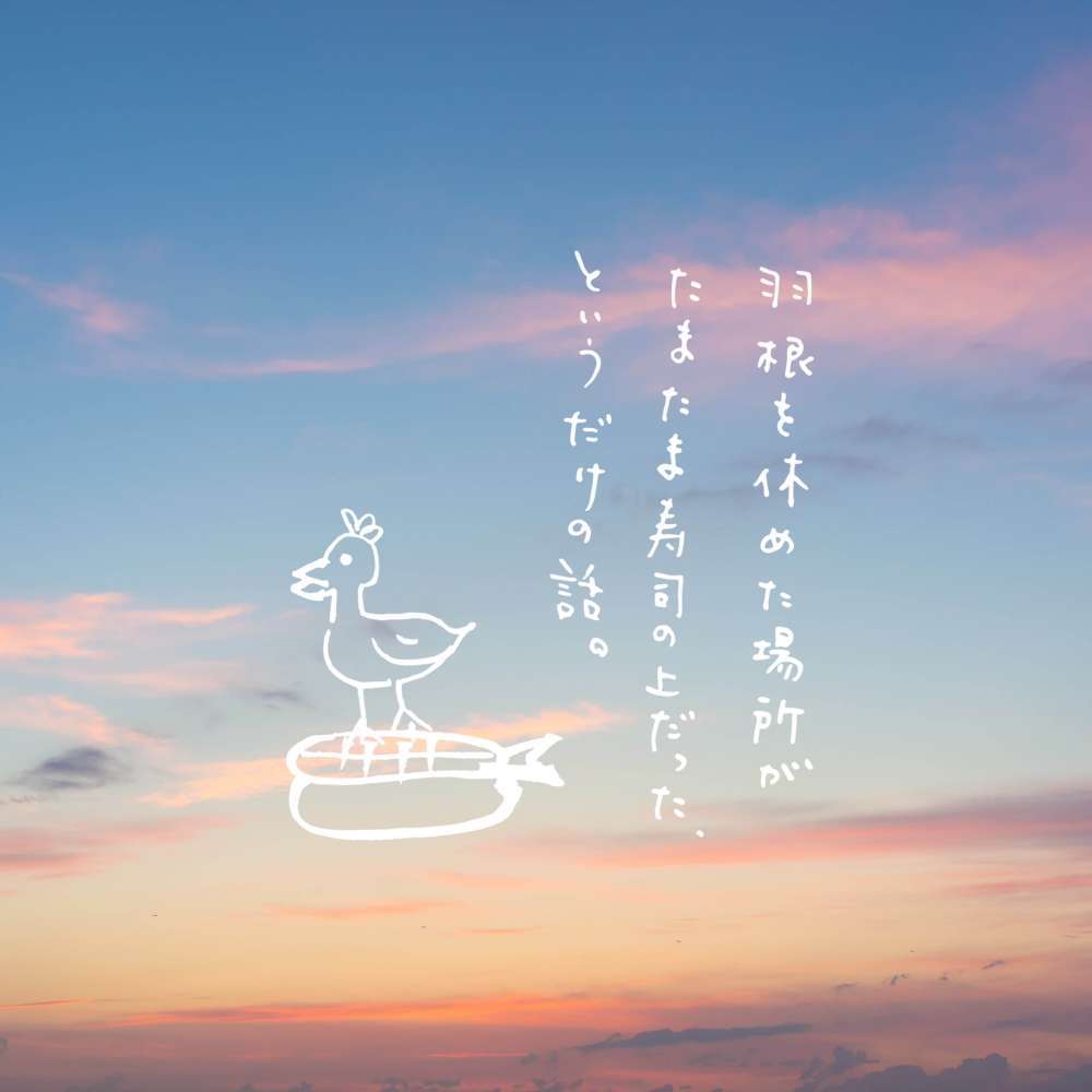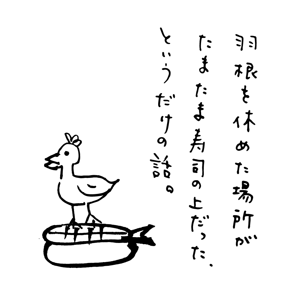 テーブルに落ちた無残なイカはもう乾きはじめていた。かつては寿司だった成れの果てを眺めながら僕は思う。彼女が、羽根を休めた場所がたまたま寿司の上だった、というだけの話だ。