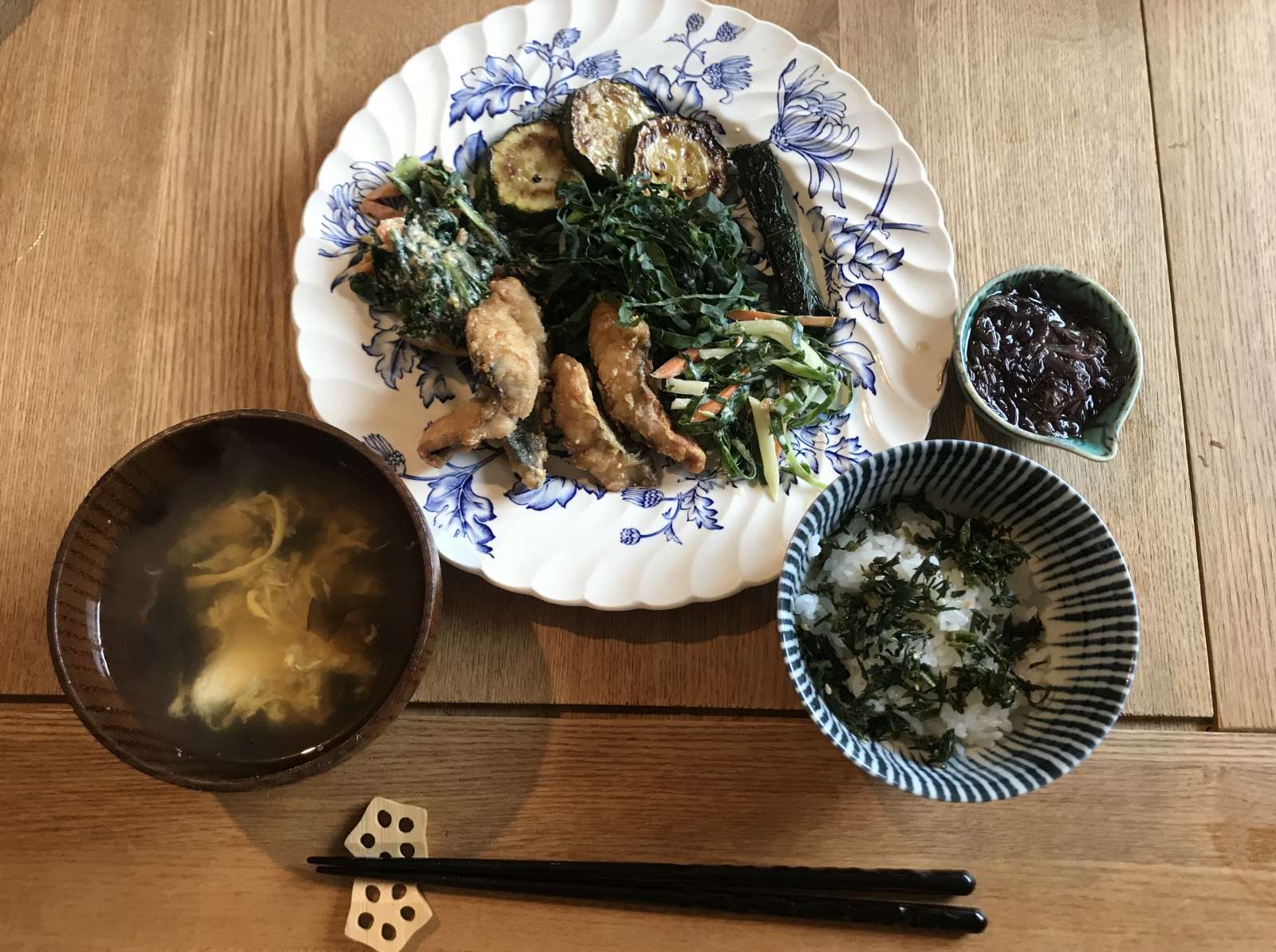 鯖竜田揚げ、ケールと人参胡麻和え、ズッキーニのソテー、ケールの千切り、キャベツとコールラビとにんじんのコールスロー、しそ味噌巻き、もずく酢、卵と天然海苔のスープ、にんじんの葉ふりかけご飯。緑ばっかり。