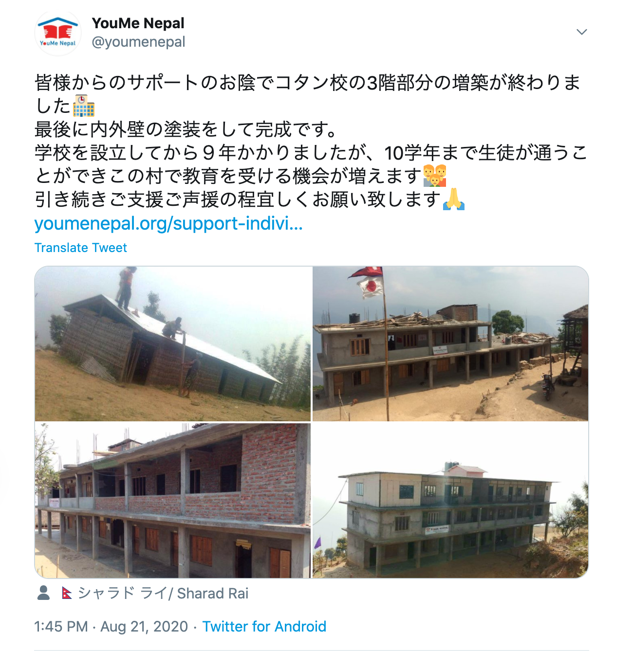 「学校設立から9年。YouMeschoolコタン校の3階部分の増築が終わりました。10学年まで生徒が通うことができ、この村で教育を受ける機会が増えます」