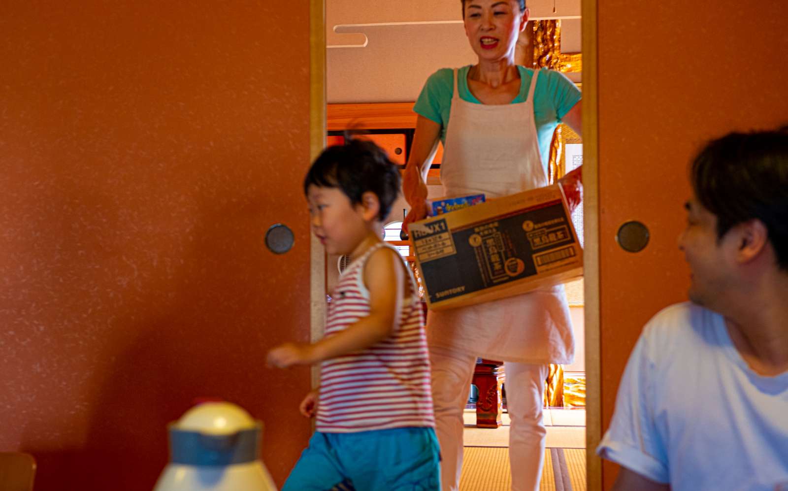 そろそろみんなで、朝ごはんだ。お座敷に戻ろう。