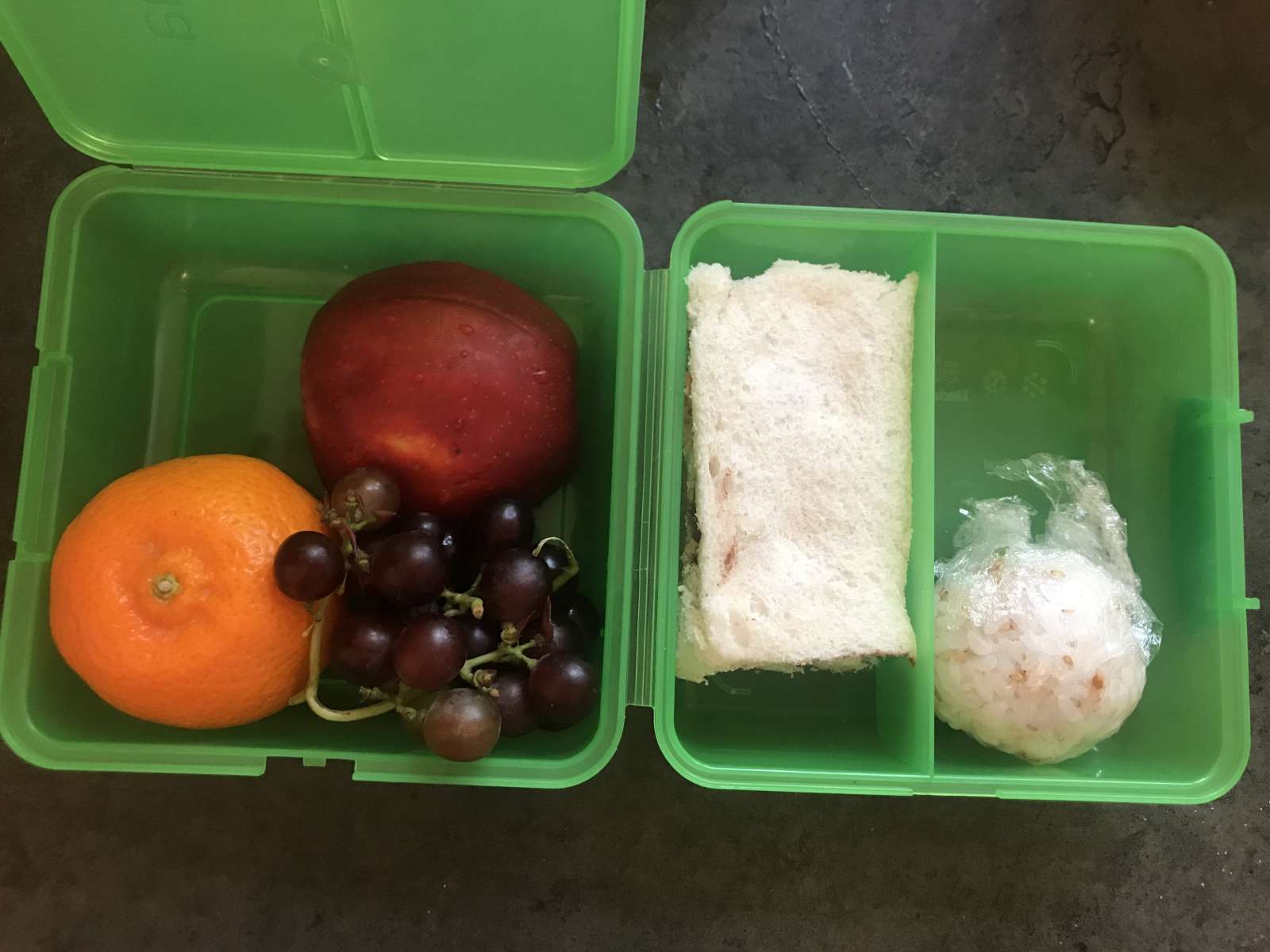 おにぎりはいれてますが、野菜も肉もほぼ入れず、サンドイッチと、フルーツくらい。