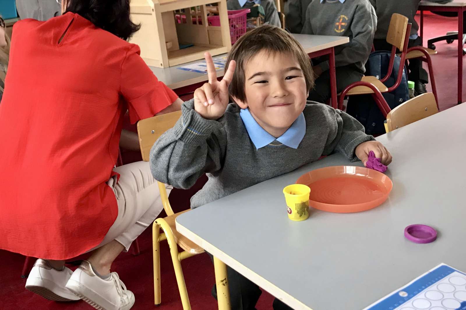 ハーイ?元気?はい、あなたの席はここよ。ではお母さんは12時に迎えに来てくださいねー。