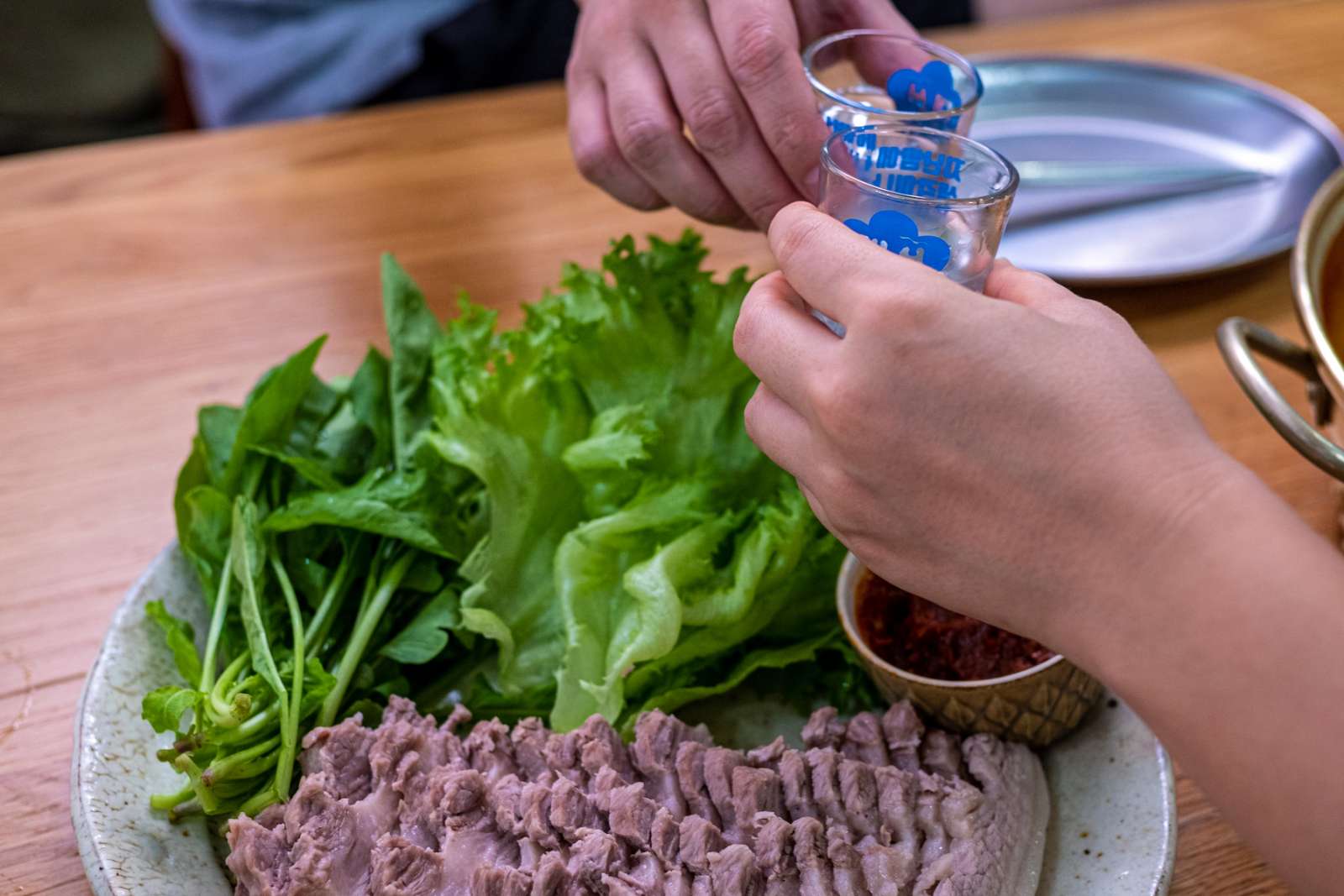 レタスやエゴマの葉などのお好みの野菜、コチュジャンと味噌を1:1で混ぜたサムジャンと一緒に食卓へ。