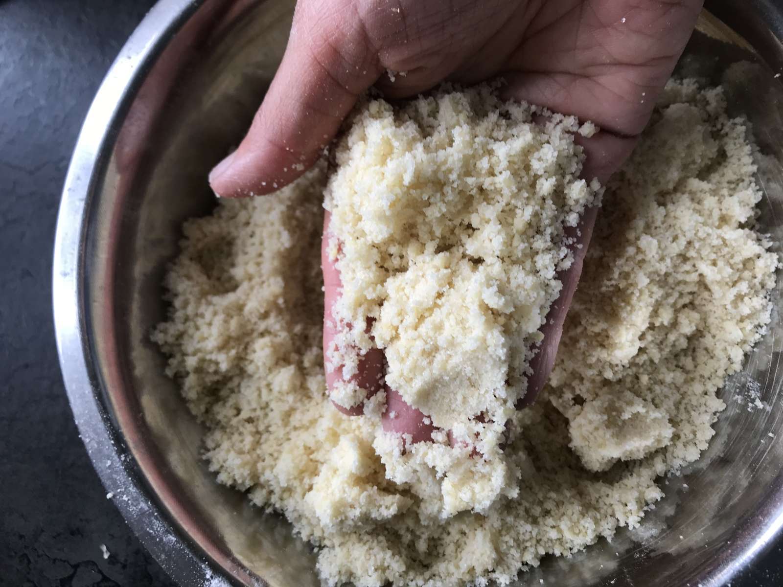 砂糖、バター、小麦粉、アーモンドパウダーを混ぜてパン粉状にサラサラにした生地をフルーツに載せてオーブンで焼くケーキ。