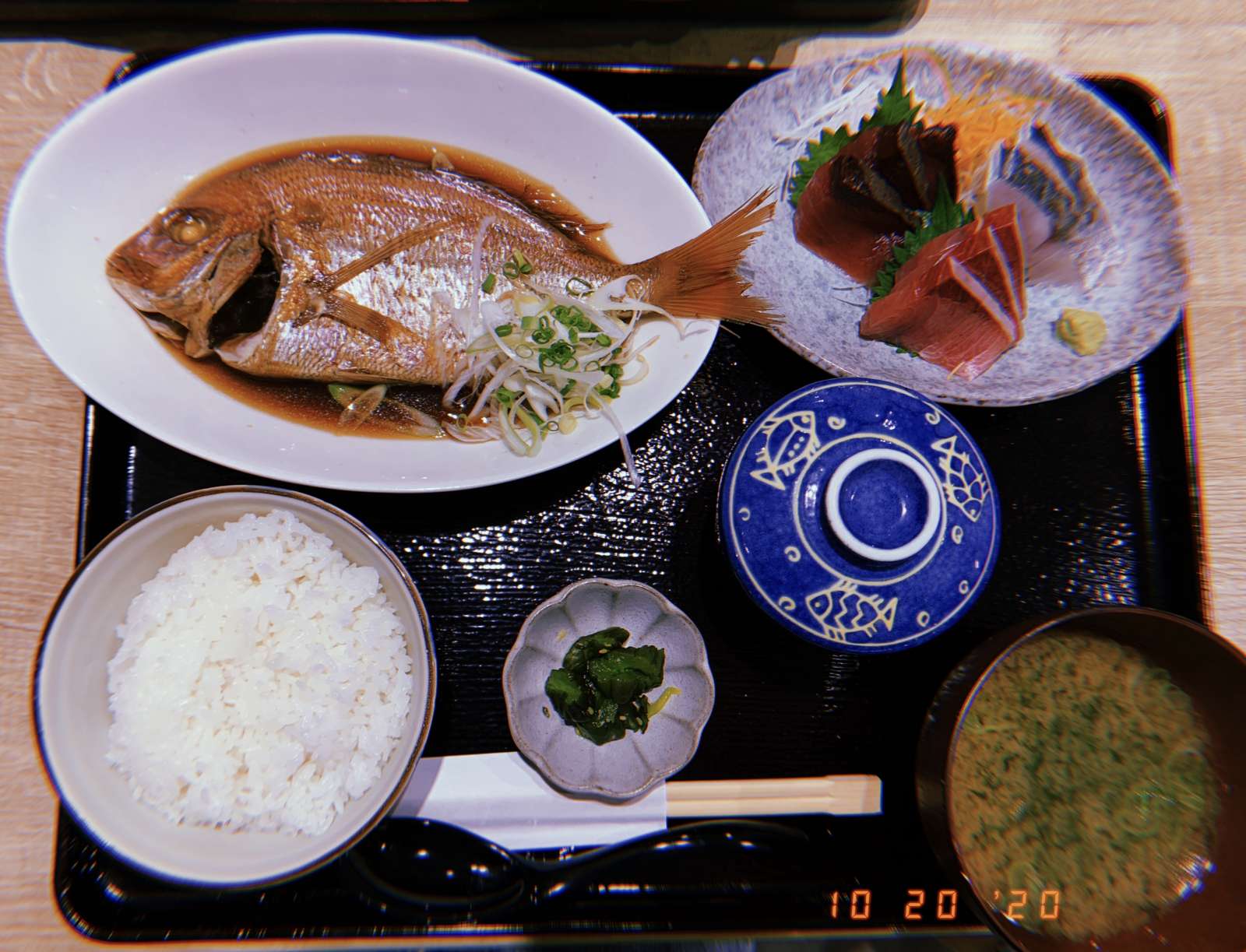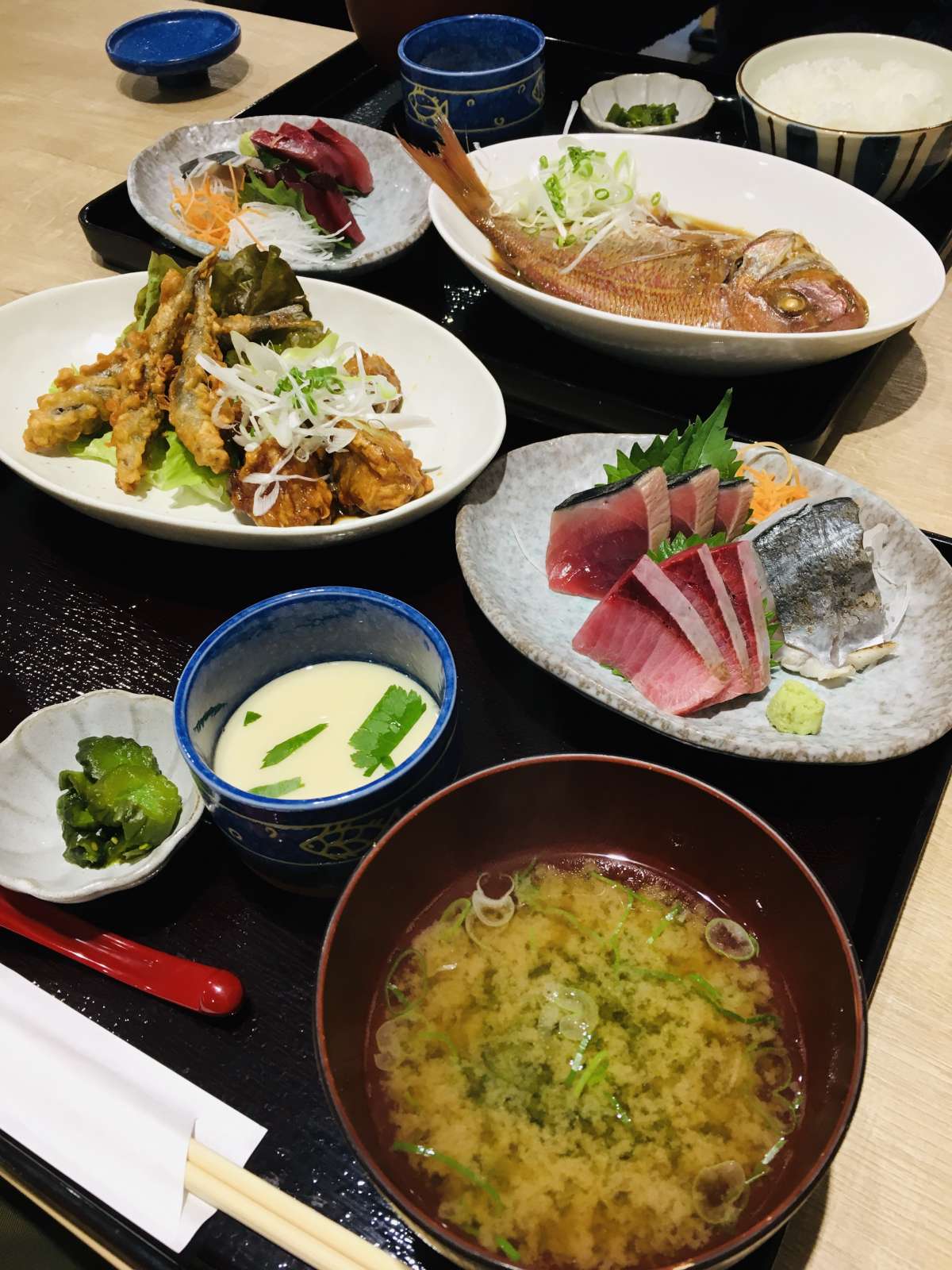 私はお刺身+まぐろの油淋鶏、オットさんは鯛の煮つけ。